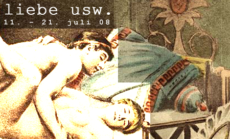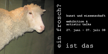 liebe usw. exhibition & performances 11. - 21. juli 08 mit beiträgen von: karl böttcher . joana brunkow . juliane ebner . patricija gilyte . andrej glusgold . inken hilgenfeld . anika hoff . sylbee kim . simona koch angela kröll . ricarda mieth . alexander negrelli anja ross . ewa surowiec . treuka . barbara ueber performer: richard rabensaat, britta helbig . jess curtis & maria francesca scaroni . ricarda mieth finissage montag 21. juli 08 . ab 18 uhr soupe populaire & performances: the symmetry project – study#9 jess curtis & maria francesca scaroni zu plan c [rica reich] von ricarda mieth mezzanin 16. juli 08 . 18 uhr drainage, performance performer: richard rabensaat, britta helbig ![]() ist das ein frosch? kunst und wissenschaft 27. juni - 07. juli 08 marcus ahlers . jofroi amaral . marek brandt . kristen cooper . mathieu dagorn . michael hoepfel . thomas kutschker . justin lépany . jenny michel . vadim schäffler . dirk sorge . doris sprengel . maik teriete . uli westphal fotos der ausstellung... special 07. juli 08 . 18 uhr die reise nach nirgendwo. vortragsreihe moderiert von doris sprengel hexagone 30. juni 08 . 18 uhr feldversuch im labor von mathieu dagorn mit alexander negrelli und nina korolewski ![]()